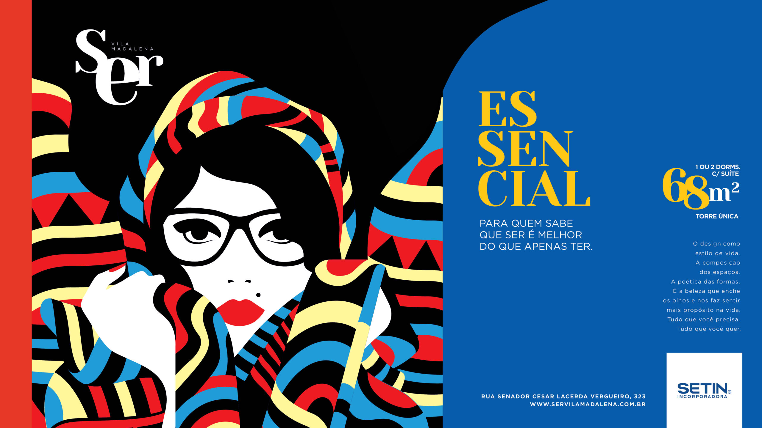 Na campanha de Ser Vila Madalena, o nome do empreendimento deixa de funcionar apenas como marca e passa a conduzir toda a comunicação. Em vez de falar só de atributos objetivos, a campanha escolhe defender um modo de vida. A frase “Para quem sabe que ser é melhor do que apenas ter” sintetiza essa virada e posiciona o projeto em um território mais ligado à identidade, ao repertório e à escolha pessoal. Essa leitura ganha força com a presença de Malika Favre, um dos nomes mais reconhecidos da ilustração contemporânea, com trabalhos para Vogue, Apple e The New Yorker, onde já assinou capas para a publicação. Ao trazer esse repertório para a campanha da Setin, Ser Vila Madalena constrói uma expressão visual mais forte e mais alinhada ao espírito criativo, urbano e autoral do bairro.